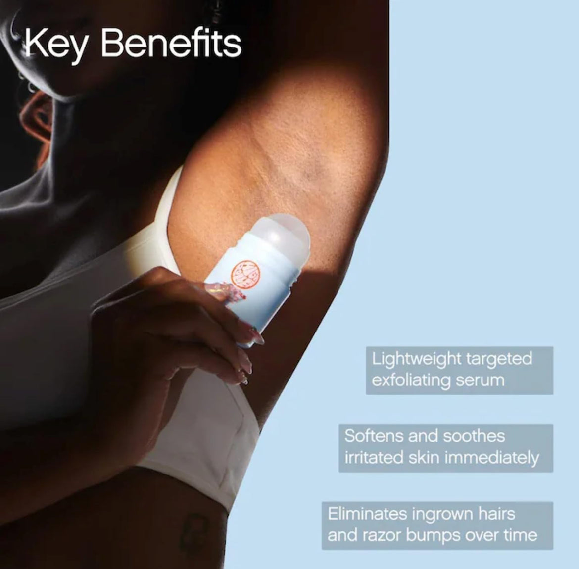 A targeted exfoliating serum that eliminates ingrown hairs, razor bumps and fading pigmentation while soothing and softening irritated skin, discouraging the formation of visible bumps in the armpits, bikini area, face, and neck.